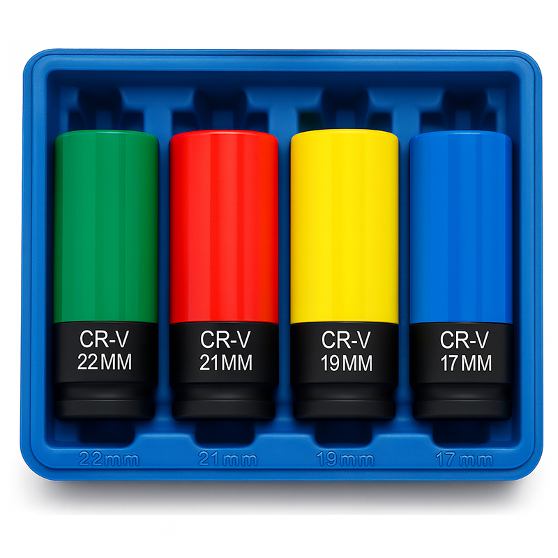 Juego de 4 dados métricos: 17 mm, 19 mm, 21 mm y 22 mm.